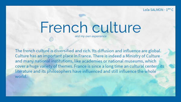 The french culture is diversified and rich. Its diffusion and influence are global. Culture has an important place in France. There is indeed a Ministry of Culture and many national institutions, like academies or national museums, which cover a huge variety of themes. France is since a long time an cultural center : its literature and its philosophers have influenced and still influence the whole world.