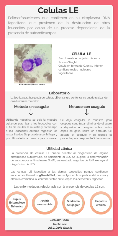 La presencia de celulas LE puede orientar al diagnostico de alguna enfermedad autoinmune, no solamente al LES. Se sugiere la determinación de anticuerpos antinucleares (ANA), un resultado negativo de ANA excluye el diagnóstico de LES.Las celulas LE fagocitan a los demas leucocitos porque contienen anticuerpos llamados IgG-anti DNA, que se fijan en la superficie del nucleo y altera la cromatina, al contener estos anticuerpos los detectan y fagocitan.
