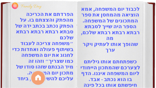 הפרדתם את הכריכה מהפתק והצצתם בו. על הפתק נכתב בכתב ידה של סבתא רבתא רבתא רבתא שלכם ״משפחה צריכה לעבוד בשיתוף פעולה ואחדות כדי לחגוג את יום המשפחה כמו שצריך״ וזהו זה מיד הבנתם שזהו סודו של מתכון יום המשפחה. עליכם להשיג אותו, ביחד