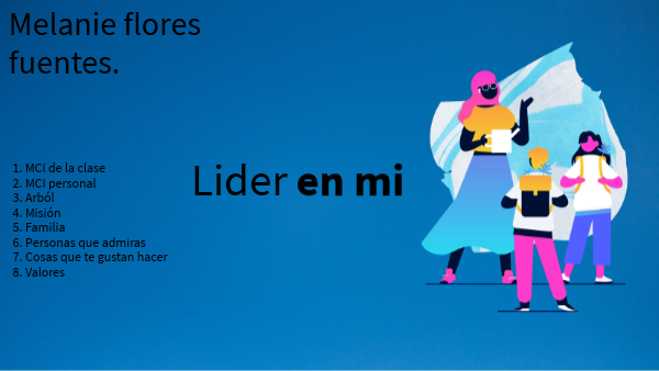 1. MCI de la clase 2. MCI personal 3. Arból 4. Misión 5. Familia 6. Personas que admiras 7. Cosas que te gustan hacer 8. Valores
