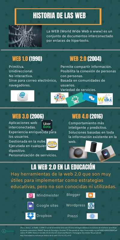 Chiu, L., Serna, L., & Padilla, J. (2014). El uso de herramientas de la web 2.0 como estrategias didácticas en el proceso de enseñanza-aprendizaje de jóvenes universitarios. PAAKAT: Revista de Tecnología y Sociedad, (7). Recuperado de: https://www.redalyc.org/pdf/4990/499051556007.pdf Latorre, M. (2018). Historia de las Web, 1.0, 2.0, 3.0 y 4.0. Universidad Marcelino Champagnat. Documento. Recuperado de: http://marinolatorre.umch.edu.pe/historia-de-la-web-1-0-2-0-3-0-y-4-0/
