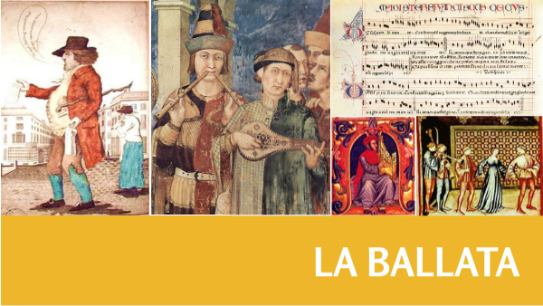 La ballata è un componimento poetico d'origine popolare, collegato con il canto e la danza (detto anche canzone a ballo), e perciò costruito metricamente in modo che le sue parti corrispondano ai movimenti di questa e ai motivi di quello. Dallo schema primitivo, quale ci appare dalle poche ballate popolari antichissime del XIII secolo, comune alle laudi sacre dello stesso tempo, si giunse per vario svolgimento a quello che, nonostante alcune varietà, fu e rimase sempre il tipico, già determinato nei poeti d'arte dell'Italia centrale, nella seconda metà del Dugento. La ballata popolare si distingue da altre forme narrative per il racconto di una storia che fa riferimento ad un unico avvenimento, sottolineandone soprattutto l'azione, a scapito della caratterizzazione dei personaggi (che avviene in forme convenzionali) e della descrizione dell'ambiente e della situazione nella quale avviene e si sviluppa la storia, trascurando l'antefatto, per introdurre gli ascoltatori direttamente in una successione di eventi che si concludono spesso in modo tragico. Il racconto è in forma impersonale, talvolta dialogata, e non contiene commenti alla vicenda, qualche volta termina con una morale.