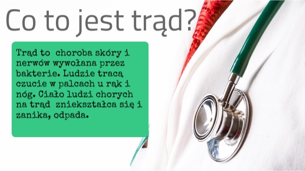 Trąd to choroba skóry i nerwów wywołana przez bakterie. Ludzie tracą czucie w palcach u rąk i nóg. Ciało ludzi chorych na trąd zniekształca się i zanika, odpada.