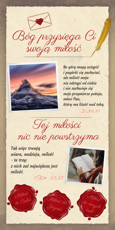Bo góry mogą ustąpić i pagórki się zachwiać, ale miłość moja nie odstąpi od ciebiei nie zachwieje się moje przymierze pokoju, mówi Pan, który ma litość nad tobą.