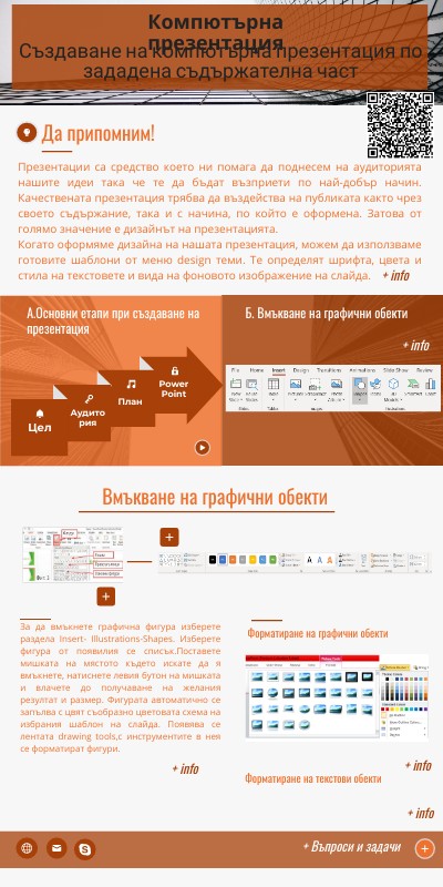 За да вмъкнете графична фигура изберете раздела Insert- Illustrations-Shapes. Изберете фигура от появилия се списък.Поставете мишката на мястото където искате да я вмъкнете, натиснете левия бутон на мишката и влачете до получаване на желания резултат и размер. Фигурата автоматично се запълва с цвят съобразно цветовата схема на избрания шаблон на слайда. Появява се лентата drawing tools,с инструментите в нея се форматират фигури.