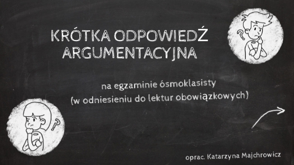 Jak widzicie, umiejętność argumentowania sprawdzana jest nie tylko podczas pisania rozprawki, ale również w zadaniach wymagających udzielenia krótkiej odpowiedzi. Takich zadań w arkuszu egzaminacyjnym jest kilka (za dwa lub 1 punkt).