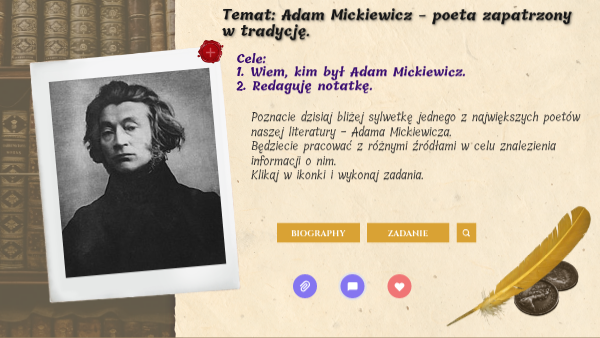 Poznacie dzisiaj bliżej sylwetkę jednego z największych poetów naszej literatury - Adama Mickiewicza. Będziecie pracować z różnymi źródłami w celu znalezienia informacji o nim. Klikaj w ikonki i wykonaj zadania.