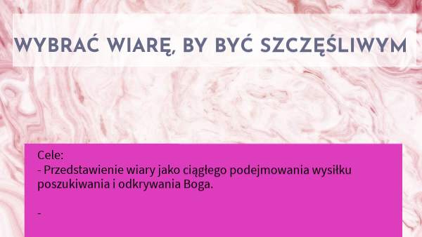 Cele: - Przedstawienie wiary jako ciągłego podejmowania wysiłku poszukiwania i odkrywania Boga. -