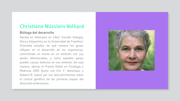 Nacida en Alemania en 1942. Estudió biología, física y bioquímica en la Universidad de Frankfurt. Pretendía estudiar de qué manera los genes influyen en el desarrollo de los organismos, convirtiendo un huevo en un embrión con sus partes diferenciadas, y cómo aquellos genes pueden causar defectos en ese embrión. De esta manera, obtuvo el Premio Nobel en Fisiología o Medicina 1995 (junto con Eric F. Wieschaus y Edward B. Lewis) por sus descubrimientos sobre el control genético de las primeras etapas del desarrollo embrionario.