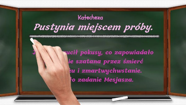 1. Pustkowie pozbawione wody.2. Tyle dni Pan Jezus przebywał na pustyni. 3. Odczucie związane z brakiem jedzenia. 4. Kusił trzykrotnie Jezusa. 5. Podpowiedź szatana, by zrobić coś złego.