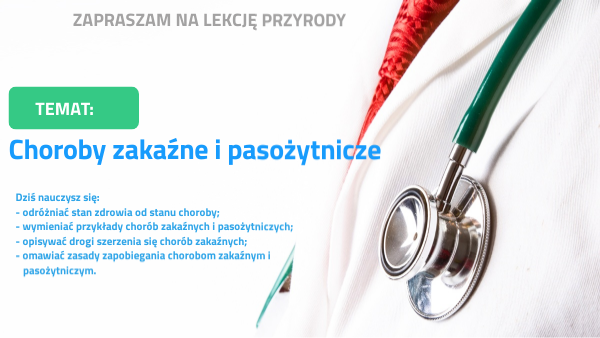 Dziś nauczysz się:- odróżniać stan zdrowia od stanu choroby; - wymieniać przykłady chorób zakaźnych i pasożytniczych; - opisywać drogi szerzenia się chorób zakaźnych; - omawiać zasady zapobiegania chorobom zakaźnym i pasożytniczym.