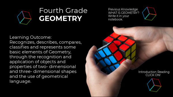 Learning Outcome: Recognizes, describes, compares, classifies and represents some basic elements of Geometry, through the recognition and application of objects and properties of two- dimensional and three- dimensional shapes and the use of geometrical language.