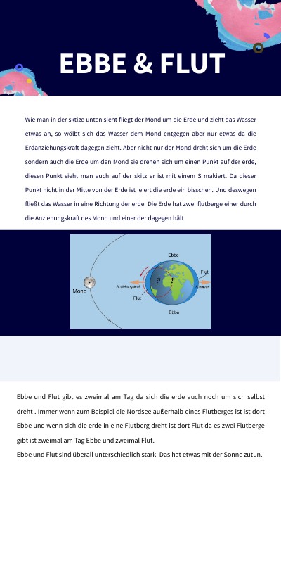 Wie man in der sktize unten sieht fliegt der Mond um die Erde und zieht das Wasser etwas an, so wölbt sich das Wasser dem Mond entgegen aber nur etwas da die Erdanziehungskraft dagegen zieht. Aber nicht nur der Mond dreht sich um die Erde sondern auch die Erde um den Mond sie drehen sich um einen Punkt auf der erde, diesen Punkt sieht man auch auf der skitz er ist mit einem S makiert. Da dieser Punkt nicht in der Mitte von der Erde ist eiert die erde ein bisschen. Und deswegen fließt das Wasser in eine Richtung der erde. Die Erde hat zwei flutberge einer durch die Anziehungskraft des Mond und einer der dagegen hält.