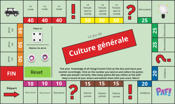Test your knowledge of all things French! Click on the dice and move your counter accordingly. Click on the number you land on and collect the points when you answer correctly. How many points did you collect at the end? Keep a record of your ansers and submit them with your score. Merci!