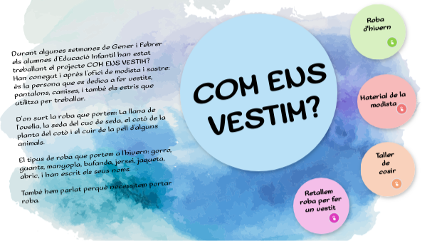 Durant algunes setmanes de Gener i Febrer els alumnes d’Educació Infantil han estat treballant el projecte COM ENS VESTIM? Han conegut i après l’ofici de modista i sastre: és la persona que es dedica a fer vestits, pantalons, camises, i també els estris que utilitza per treballar. D’on surt la roba que portem: La llana de l’ovella, la seda del cuc de seda, el cotó de la planta del cotó i el cuir de la pell d’alguns animals. El tipus de roba que portem a l’hivern: gorro, guants, manyopla, bufanda, jersei, jaqueta, abric, i han escrit els seus noms. També hem parlat perquè necessitem portar roba.