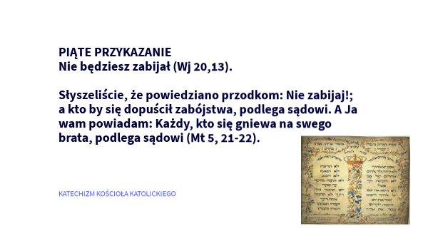 PIĄTE PRZYKAZANIE Nie będziesz zabijał (Wj 20,13). Słyszeliście, że powiedziano przodkom: Nie zabijaj!; a kto by się dopuścił zabójstwa, podlega sądowi. A Ja wam powiadam: Każdy, kto się gniewa na swego brata, podlega sądowi (Mt 5, 21-22).