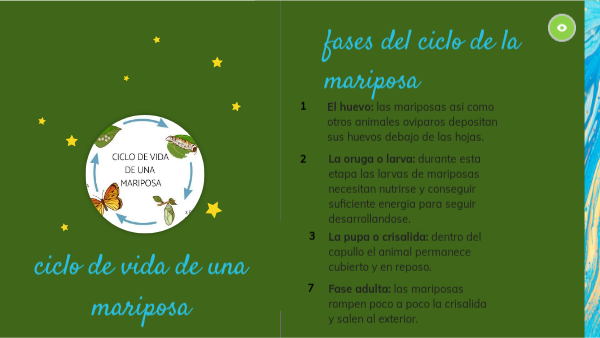 La oruga o larva: durante esta etapa las larvas de mariposas necesitan nutrirse y conseguir suficiente energia para seguir desarrollandose.