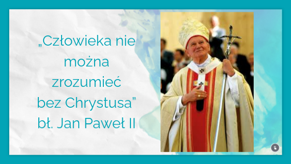"Człowieka nie można do końca zrozumieć bez Chrystusa. A raczej: człowiek nie może siebie sam do końca zrozumieć bez Chrystusa. Nie może rozumieć, ani kim jest, ani jaka jest jego właściwa godność, ani jakie jest jego powołanie i ostateczne przeznaczenie. Nie może tego wszystkiego zrozumieć bez Chrystusa." (JPII)