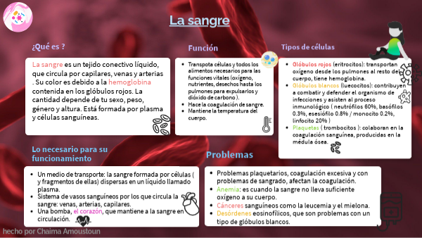 La sangre es un tejido conectivo líquido, que circula por capilares, venas y arterias . Su color es debido a la hemoglobina contenida en los glóbulos rojos. La cantidad depende de tu sexo, peso, género y altura. Está formada por plasma y células sanguíneas.
