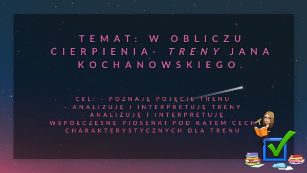 cel: - poznaję pojęcie trenu- analizuję i interpretuję treny - Analizuję i interpretuję współczesne piosenki pod kątem cech charakterystycznych dla trenu