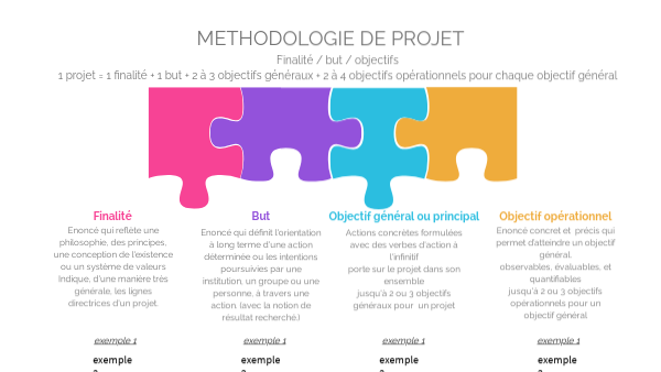 Finalité / but / objectifs 1 projet = 1 finalité + 1 but + 2 à 3 objectifs généraux + 2 à 4 objectifs opérationnels pour chaque objectif général