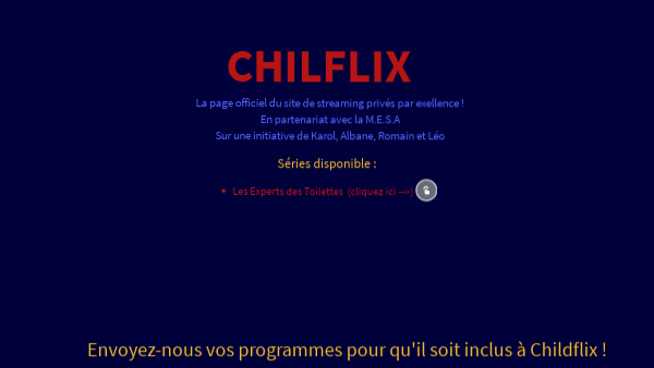 La page officiel du site de streaming privés par exellence ! En partenariat avec la M.E.S.A Sur une initiative de Karol, Albane, Romain et Léo