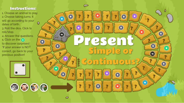 1. Choose an animal to play.2. Choose taking turns. It will go according to your dates of birth. 3. Roll the dice. Click to roll/stop. 4. Answer the questions. 5. Click on the to discover surprises! *If your answer is NOT correct, go back to your previous position!