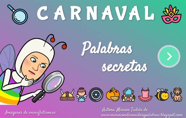 Actividad para trabajar la conciencia fonológica. Consiste en seleccionar la primera letra de cada imagen para descubrir así una palabra secreta de carnaval.