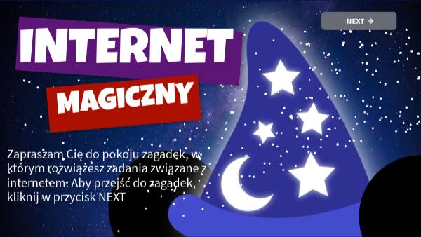 Zapraszam Cię do pokoju zagadek, w którym rozwiążesz zadania związane z internetem. Aby przejść do zagadek, kliknij w przycisk NEXT