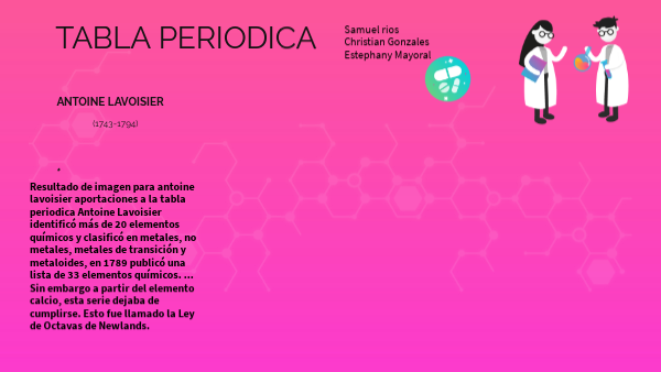 Resultado de imagen para antoine lavoisier aportaciones a la tabla periodica Antoine Lavoisier identificó más de 20 elementos químicos y clasificó en metales, no metales, metales de transición y metaloides, en 1789 publicó una lista de 33 elementos químicos. ... Sin embargo a partir del elemento calcio, esta serie dejaba de cumplirse. Esto fue llamado la Ley de Octavas de Newlands.