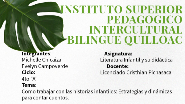 Integrantes: Asignatura: Michelle Chicaiza Literatura Infantil y su didáctica Evelyn Campoverde Docente: Ciclo: Licenciado Cristhian Pichasaca 4to "A" Tema: Como trabajar con las historias infantiles: Estrategias y dinámicas para contar cuentos.