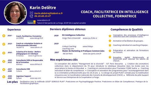 Co-conception des ateliers "Management de la diversité" - IUT Paris Descartes Création des animations collectives dans le département du 78 pour introduire la robotique éducative dans les écoles avec les associations In-Genius et Educabot Coaching en communication pour l'hackaton 'ESME Sudria Coaching individuel et bilan de compétences Conception et animation des programmes pour l'accompagnement dans la co-orientation professionnelle pour les 18-25 ans Co-design du projet PCAET (climat) pour la mobilisation citoyenne avec la Coordination nationale des Conseils de développement (CNCD) Référente du pôle Support et Service aux Entreprises de la Coopérative La Forge.