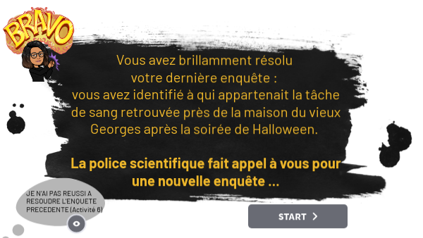 Vous avez brillamment résolu votre dernière enquête : vous avez identifié à qui appartenait la tâche de sang retrouvée près de la maison du vieux Georges après la soirée de Halloween. Les enfants ont été retrouvé sain et sauf par vos collègues. Il s'est avéré que Bastien était tombé après s'être fait poursuivre par un zombie... plus de peur que de mal ! Mais la police scientifique fait appel à vous pour une nouvelle enquête ...