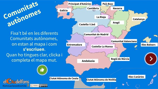 Fixa't bé en les diferents Comunitats autònomes, on estan al mapa i com s'escriuen.Quan ho tingues clar, clicka i completa el mapa mut.