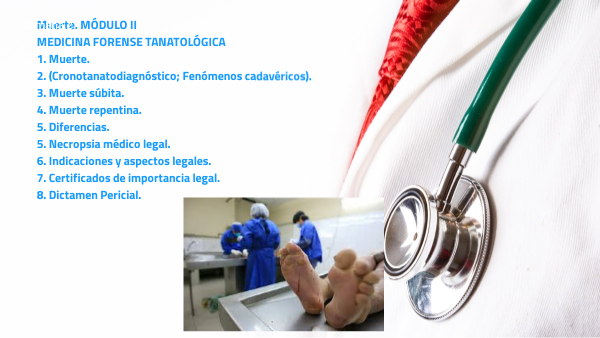 Muerte. MÓDULO II MEDICINA FORENSE TANATOLÓGICA 1. Muerte. 2. (Cronotanatodiagnóstico; Fenómenos cadavéricos). 3. Muerte súbita. 4. Muerte repentina. 5. Diferencias. 5. Necropsia médico legal. 6. Indicaciones y aspectos legales. 7. Certificados de importancia legal. 8. Dictamen Pericial.