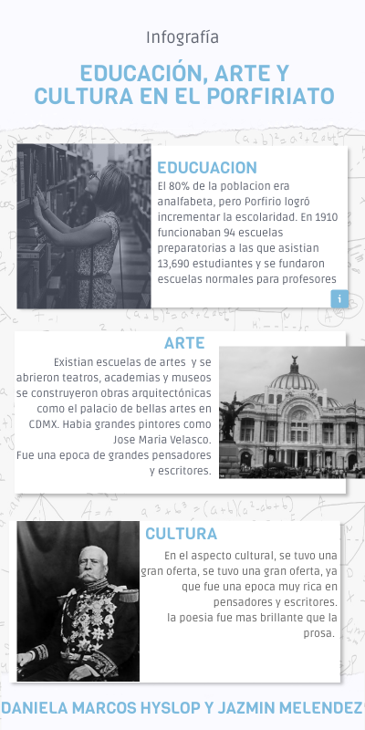 Existian escuelas de artes y se abrieron teatros, academias y museos se construyeron obras arquitectónicas como el palacio de bellas artes en CDMX. Habia grandes pintores como Jose Maria Velasco. Fue una epoca de grandes pensadores y escritores.