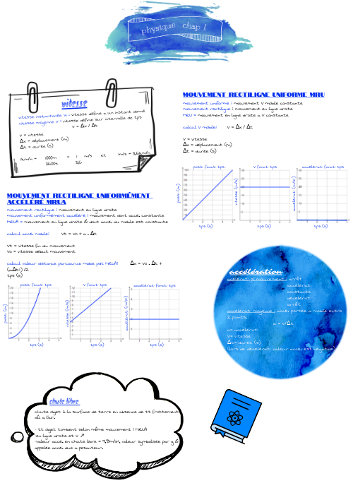 mouvement rectiligne : mouvement en ligne droite mouvement uniformément accéléré : mouvement dont accé. constante MRUA = mouvement en ligne droite & dont accé. du mobile est constante calcul accé. mobile: Vt = Vo + a . ∆t Vt = vitesse fin du mouvement Vo = vitesse début mouvement calcul valeur distance parcourue mobie pdt MRUA: ∆x = Vo . ∆t + (a.∆t²) /2 tps (s)
