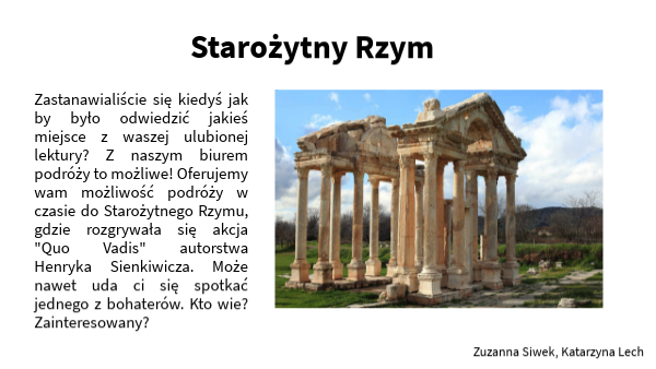 Zastanawialiście się kiedyś jak by było odwiedzić jakieś miejsce z waszej ulubionej lektury? Z naszym biurem podróży to możliwe! Oferujemy wam możliwość podróży w czasie do Starożytnego Rzymu, gdzie rozgrywała się akcja "Quo Vadis" autorstwa Henryka Sienkiwicza. Może nawet uda ci się spotkać jednego z bohaterów. Kto wie? Zainteresowany?