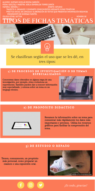 Alumno: Gustavo Nicolás Rocha Carrión Fecha:10/02/2021 Maestra: Adela Esmeralda Torres García Materia: Español 1 Ámbito: Estudio Trayecto 9: Organizo y comparto conocimientos mediante fichas temáticas Práctica social de lenguaje: Elaboración de textos que presentan información resumida proveniente de diversas fuentes. Colegio Ethel Sutton Número de actividad 9.6