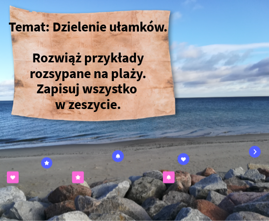 Temat: Dzielenie ułamków. Rozwiąż przykłady rozsypane na plaży. Zapisuj wszystko w zeszycie.