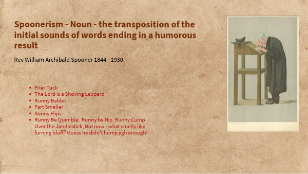 Spoonerism - Noun - the transposition of the initial sounds of words ending in a humorous result