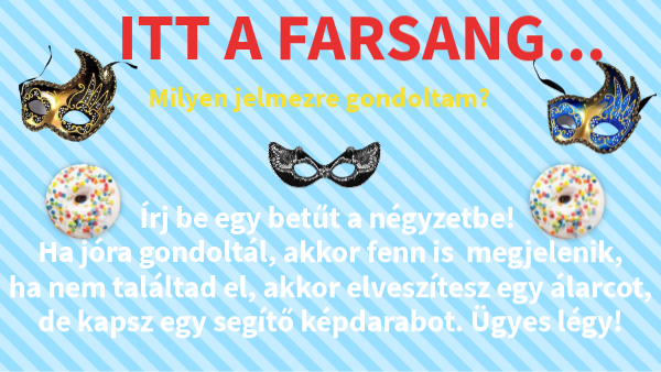 Írj be egy betűt a négyzetbe! Ha jóra gondoltál, akkor fenn is megjelenik, ha nem találtad el, akkor elveszítesz egy álarcot, de kapsz egy segítő képdarabot. Ügyes légy!