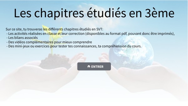 Sur ce site, tu trouveras les différents chapitres étudiés en SVT: - Les activités réalisées en classe et leur correction (disponibles au format pdf, pouvant donc être imprimés), - Les bilans associés - Des vidéos complémentaires pour mieux comprendre - Des mini-jeux ou exercices pour tester tes connaissances, ta compréhension du cours.