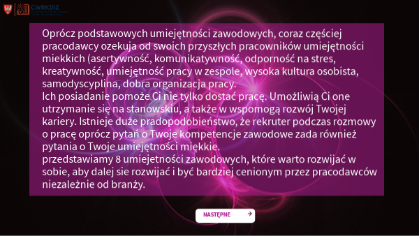 Oprócz podstawowych umiejętności zawodowych, coraz częściej pracodawcy ozekuja od swoich przyszłych pracowników umiejętności miekkich (asertywność, komunikatywność, odporność na stres, kreatywność, umiejętność pracy w zespole, wysoka kultura osobista, samodyscyplina, dobra organizacja pracy. Ich posiadanie pomoże Ci nie tylko dostać pracę. Umożliwią Ci one utrzymanie się na stanowskiu, a także w wspomogą rozwój Twojej kariery. Istnieje duże pradopodobieństwo, że rekruter podczas rozmowy o pracę oprócz pytań o Twoje kompetencje zawodowe zada również pytania o Twoje umiejętności miękkie. przedstawiamy 8 umiejetności zawodowych, które warto rozwijać w sobie, aby dalej sie rozwijać i być bardziej cenionym przez pracodawców niezależnie od branży.