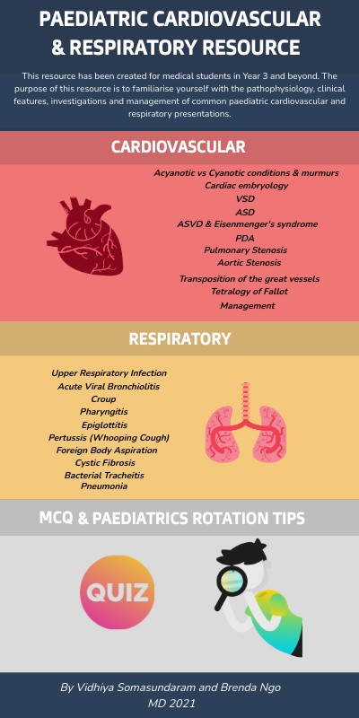 This resource has been created for medical students in Year 3 and beyond. The purpose of this resource is to familiarise yourself with the pathophysiology, clinical features, investigations and management of common paediatric cardiovascular and respiratory presentations.