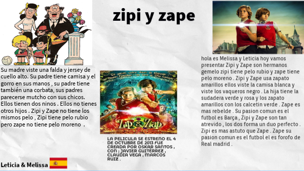 hola es Melissa y Leticia hoy vamos presentar Zipi y Zape son hermanos gemelo zipi tiene pelo rubio y zape tiene pelo moreno . Zipi y Zape usa zapato amarillos ellos viste la camisa blanca y viste los vaqueros negro . La hija tiene la sudadera verde y rosa y los zapato amarillos con los calcetin verde . Zape es mas rebelde . Su pasion comun es el futbol es Barça , Zipi y Zape son tan atrevido , los dos forma un duo perfecto . Zipi es mas astuto que Zape . Zape su pasion comun es el futbol el es forofo de Real madrid .
