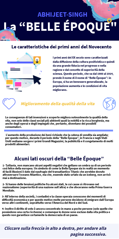 1- Tuttavia, non mancano alcuni aspetti negativi che gettano un ombra su di un periodo così felice della europea. Un simbolo di come la Belle Époque sia in realtà un momento di facili illusioni è dato dal naufragio del transatlantico Titanic che avrebbe dovuto attraversare l’oceano Atlantico, ma che, essendo stato urtato da un iceberg, non arrivò mai a destinazione.