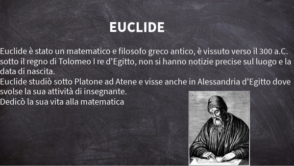 Euclide è stato un matematico e filosofo greco antico, è vissuto verso il 300 a.C. sotto il regno di Tolomeo I re d'Egitto, non si hanno notizie precise sul luogo e la data di nascita. Euclide studiò sotto Platone ad Atene e visse anche in Alessandria d'Egitto dove svolse la sua attività di insegnante. Dedicò la sua vita alla matematica