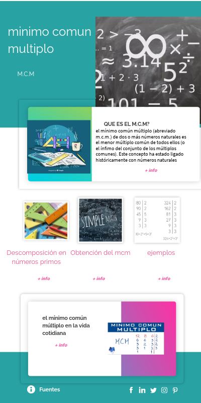 el mínimo común múltiplo (abreviado m.c.m.) de dos o más números naturales es el menor múltiplo común de todos ellos (o el ínfimo del conjunto de los múltiplos comunes). Este concepto ha estado ligado históricamente con números naturales