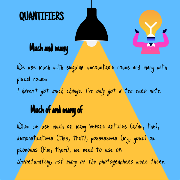We use much with singular uncountable nouns and many with plural nouns:I haven’t got much change. I’ve only got a ten euro note.
